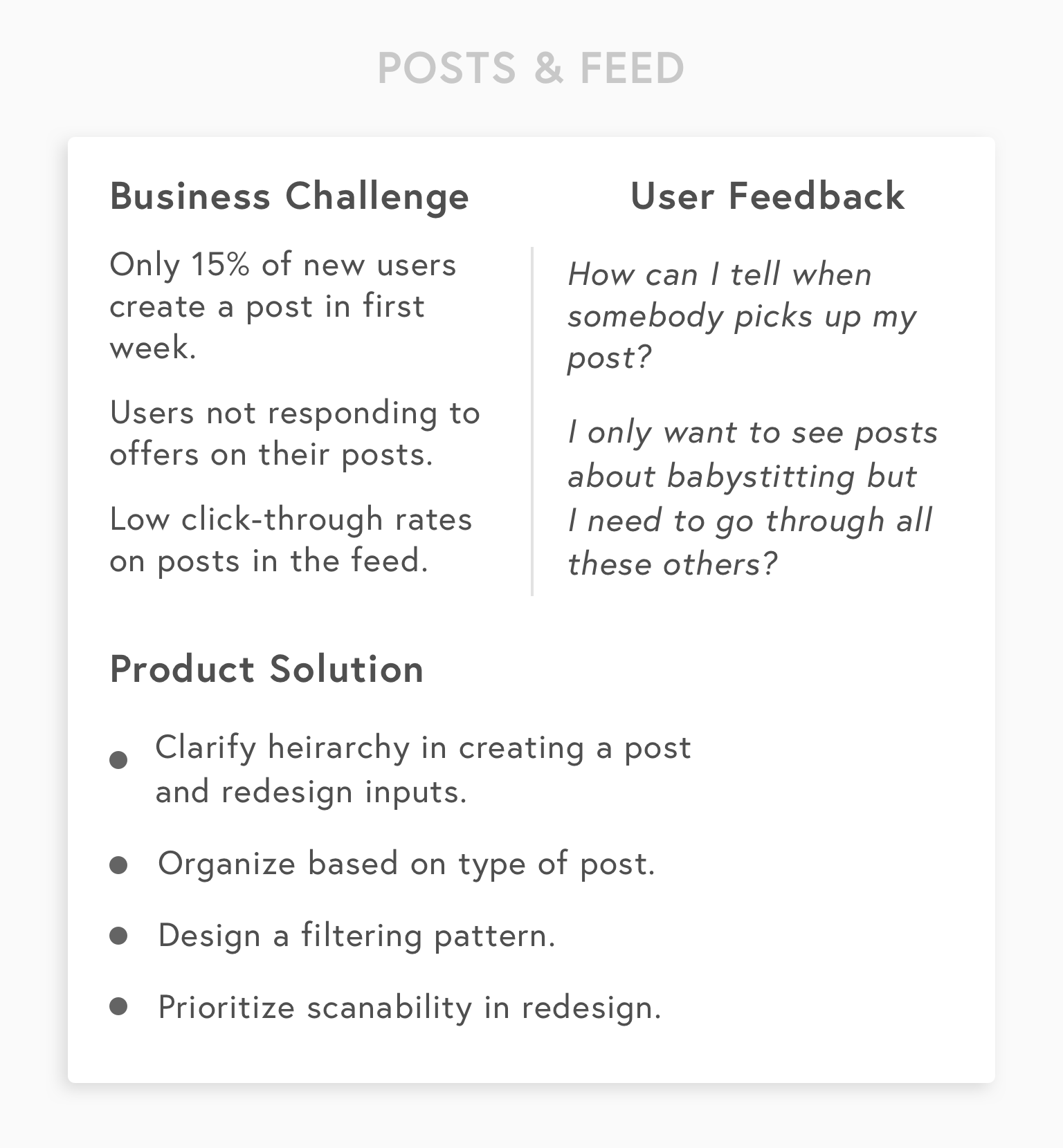 The Feed is Allo’s central communication channel. This is where users discover and respond to posts, manage their own posts and browse activity in their immediate and extended circles. Unfortunately, during our tests, we found that users were having a hard time finding relevant information, leading to high churn and low engagement.