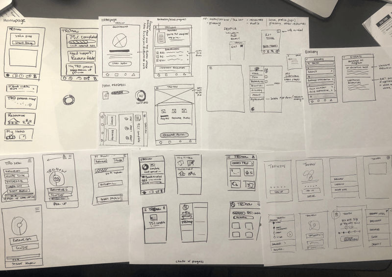 Every survivor we interviewed declared lack of transparency around the application process as one of the greatest pain points. To begin ideating we sketched a series of ideas, including: a set of screener questions, a swipe guide and an onboarding flow requiring login credentials.
